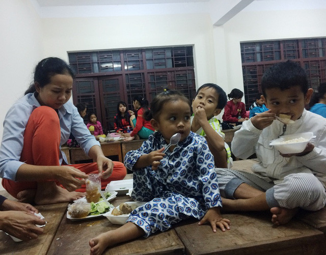 Ba mẹ con chị Danh Thị Bé Loan ăn bữa cơm tối do chính quyền địa phương phục vụ.