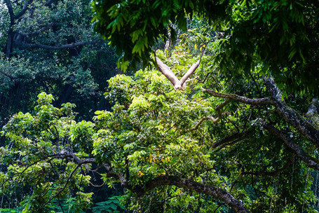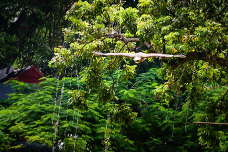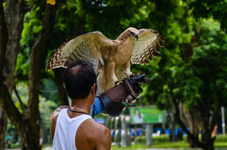 Khi “huấn luyện viên” hất tay lên, đại bàng bay lên cây. “Huấn luyện viên” thổi còi và trên tay cầm thịt chim cút, chú đại bàng sà xuống tay.