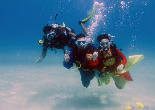 Họ lặn ở độ sâu khoảng 5 mét. Mỗi cặp được một thợ lặn đi cùng để đảm bảo an toàn. Ảnh: Vietravel.