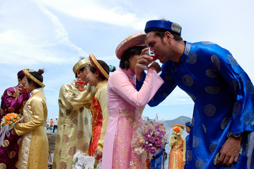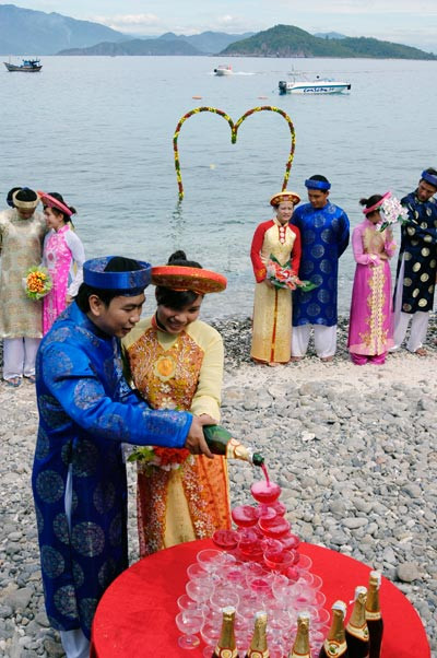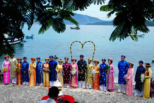 10 cặp cô dâu, chú rể đến từ các thành phố Đà Lạt, TP HCM, Nha Trang... Chi phí tham dự lễ cưới độc đáo này khoảng 6 triệu đồng cho mỗi cặp.