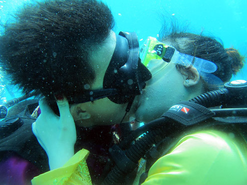 Trao nhau nụ hôn ngọt ngào. Sau đó các cặp uyên ương bơi một vòng tham quan san hô dưới đáy biển, thời gian diễn ra chưa đầy 30 phút. Ảnh: Vietravel.