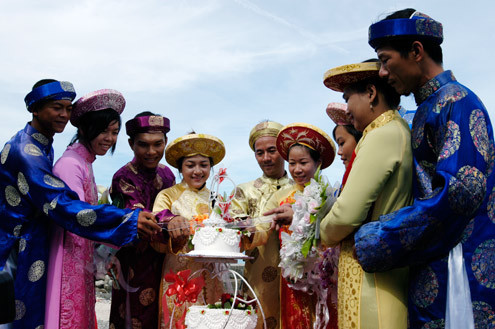 8h30 sáng, các cặp uyên ương mặc bộ đồ lặn bên trong, cô dâu mặc áo dài, chú rể áo the khăn đống ra ngoài.
