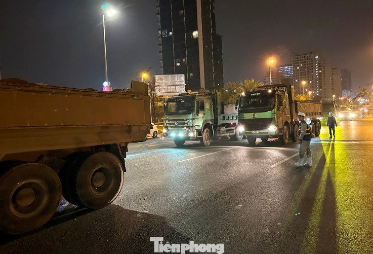 | Để kiểm định độ võng mặt cầu, khả năng chịu lực của các nhịp, dầm cầu, đơn vị thi công đã sử dụng dàn xe tải loại hổ vồ (Howo) xếp thành 3 hàng dài đi với tốc độ chậm, hoặc có đoạn đứng yên trên cầu. |