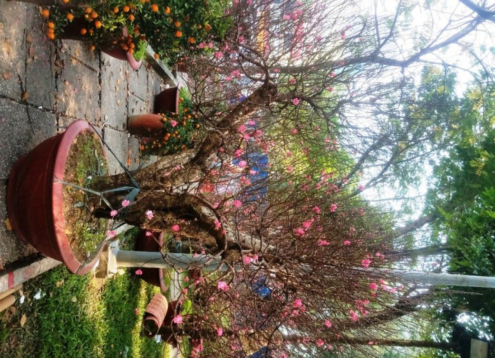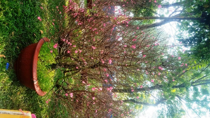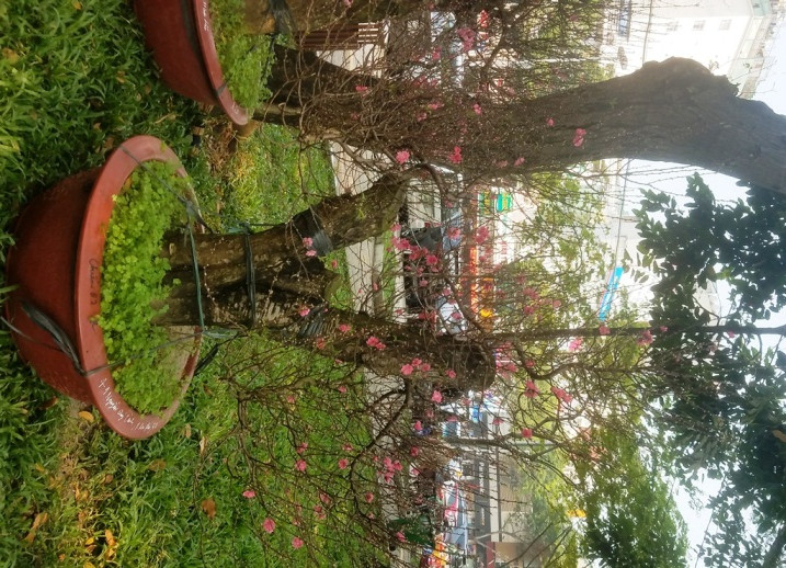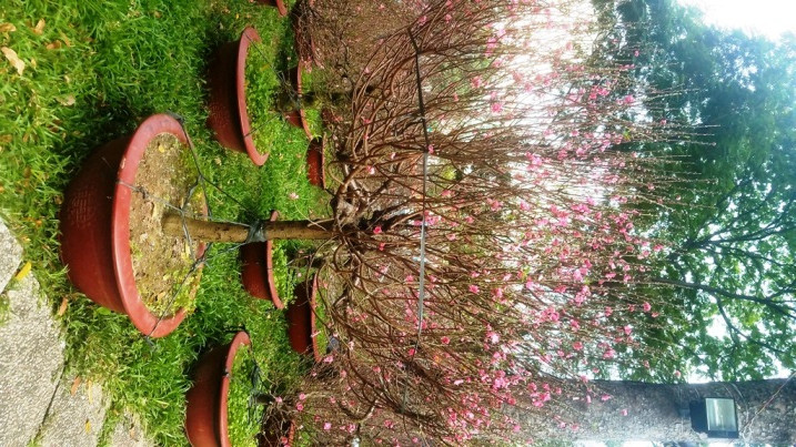 Những cây đào Nhật Tân với nhiều tư thế, kiểu dáng, có giá hàng chục triệu đồng đua nhau khoe sắc trên công viên chuẩn bị đón Tết Mậu Tuất 2018.