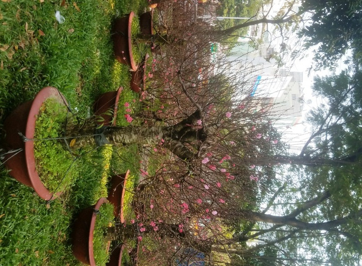 Tại công viên 23/9, quận 1, TPHCM, các thương lái từ miền Bắc đã vận chuyển đào Nhật Tân vào bày bán.