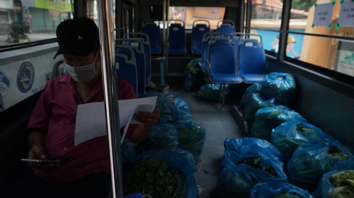 | Những mặt hàng như rau, củ sẽ được nhân viên đóng gói sẵn, người dân chỉ việc lấy, sau đó nhân viên xe buýt xe cân và thanh toán. |