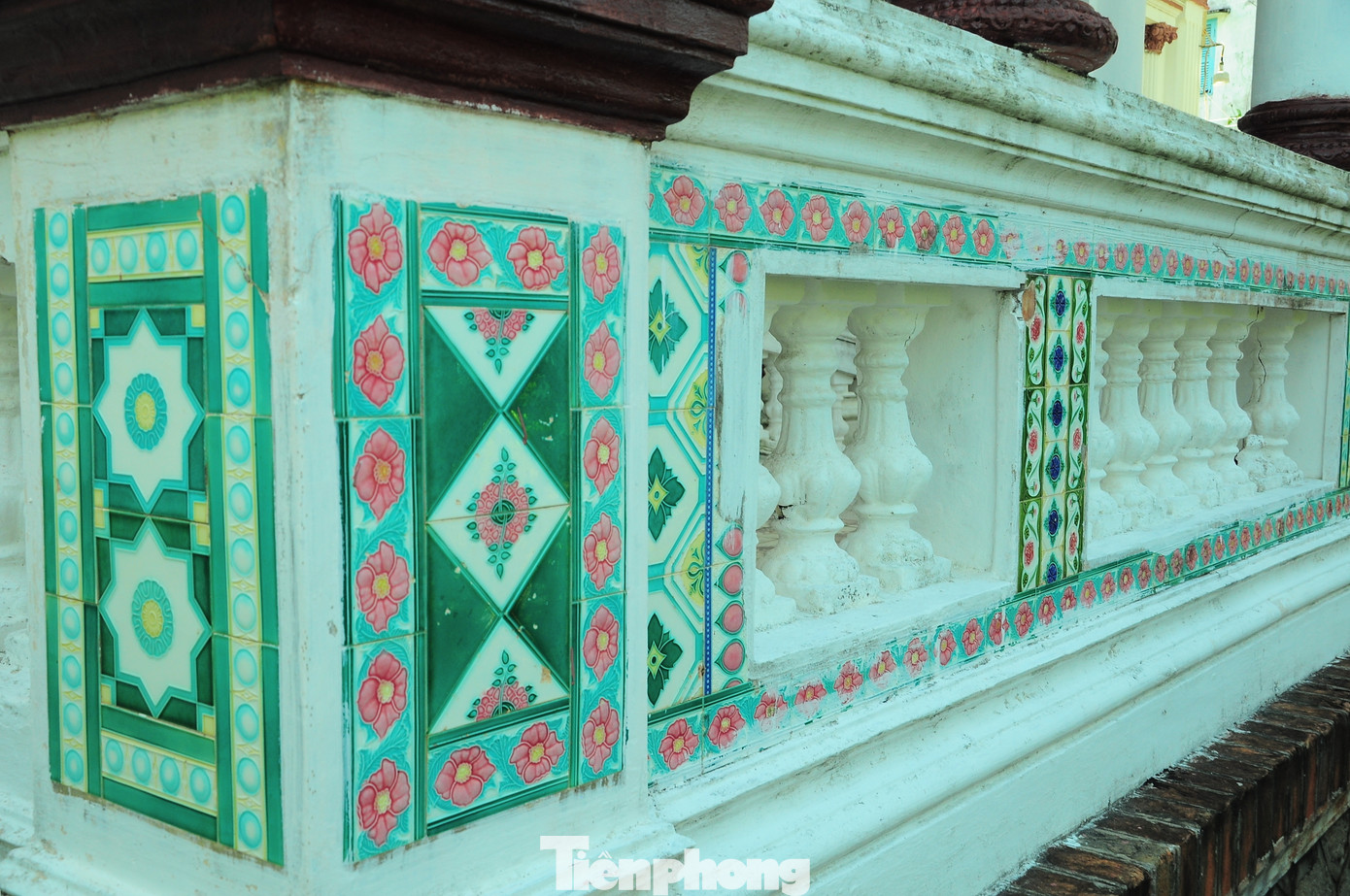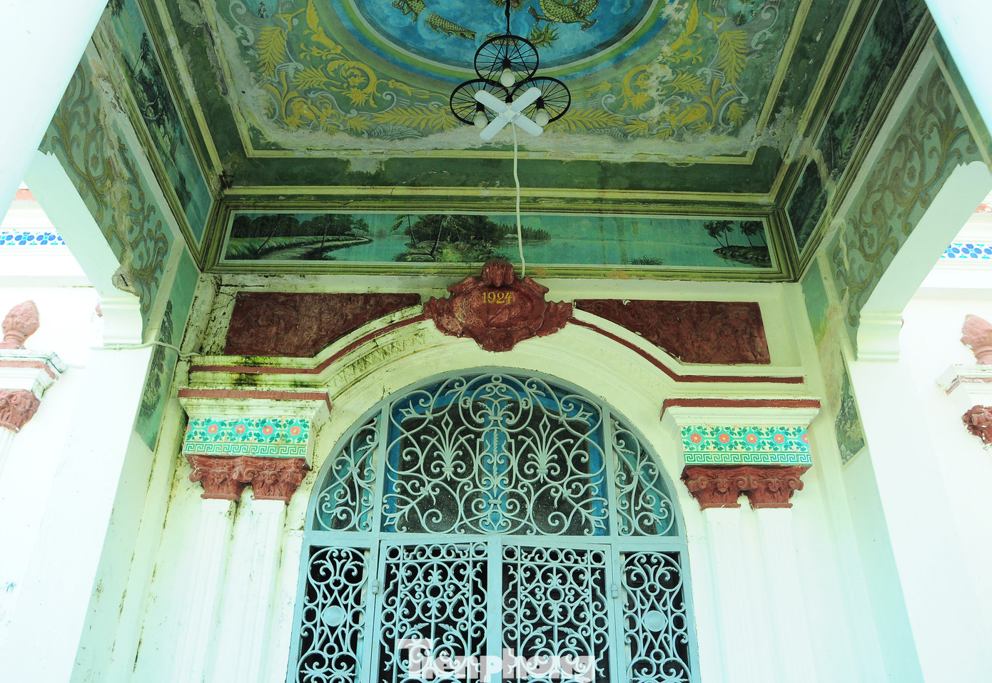 | Sảnh đón nằm giữa nhà và nhô ra phía trước. Trên các cột đều gắn phù điêu; trần, vách có tranh vẽ về đề tài ngư - tiều - canh - độc, núi sông, nhà cửa, ghe thuyền... |