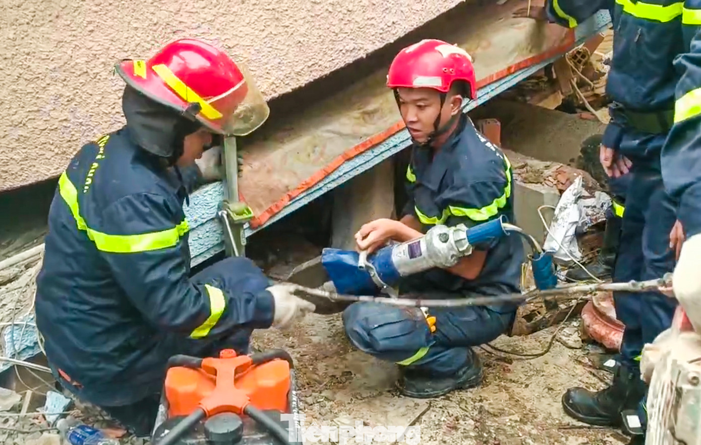 | Lực lượng chức năng nhanh chóng triển khai thang sắt, xà beng, kiềm cộng lực, xẻng... đào bới trong đống đổ nát, cắt sắt tìm kiếm nạn nhân do căn nhà đổ sập có nhiều khung thép nằm ở phía trên. |