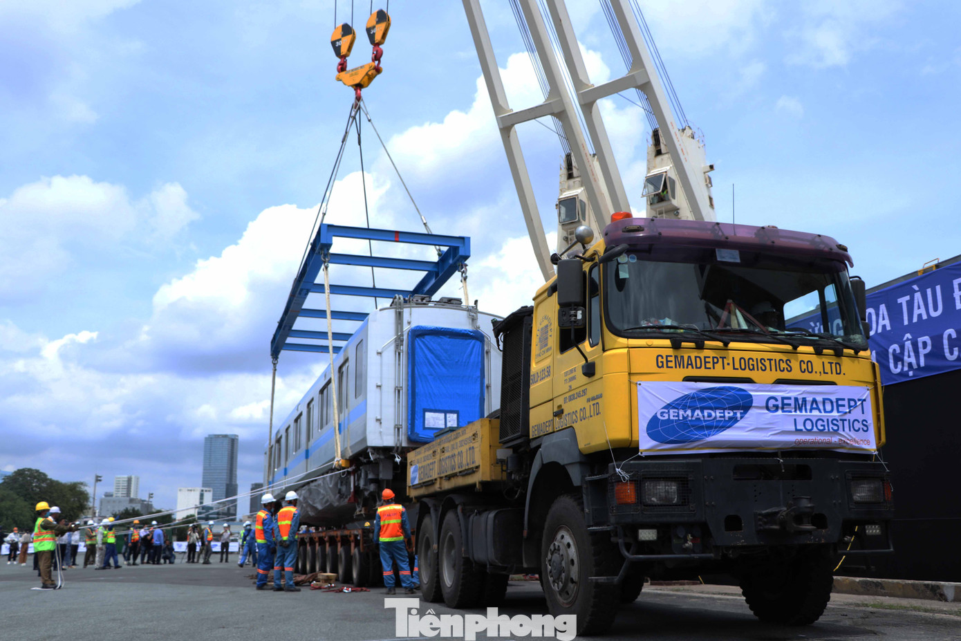 TPO - Đoàn tàu đầu tiên của tuyến Metro số 1 (Bến Thành - Suối Tiên) TPHCM đã cập cảng Khánh Hội, quận 4 và đang được hạ thủy để vận chuyển về Depot Long Bình trước khi chạy thử trong thời gian tới.
