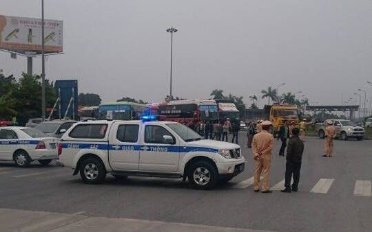 Khung cảnh lực lượng chức năng dừng đoàn xe khách tỉnh Thái Bình, Nam Định tại trạm thu phí Pháp Vân. Hàng chục tài xế, phục xe phản ứng khiến nút giao này trở nên hỗn loạn.