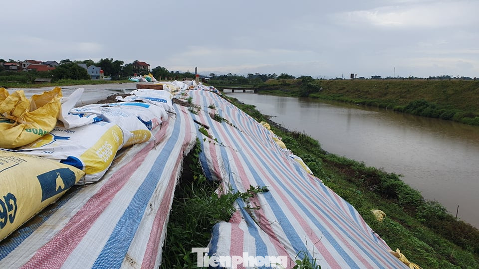 Ngày 19/8 vừa qua, UBND xã Cao Xá đã huy động gần 200 người dân khắc phục sạt lở bằng cách đóng các bao tải đất để gia cố tuyến đê.