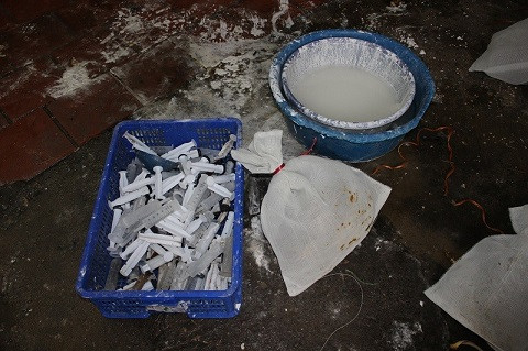 Ngoài ra, có rất nhiều “dụng cụ chuyên dụng” như chậu bột đá trắng, bơm tiêm, que tre dài… để “phù phép” nhồi vào bụng các con vật nhằm tăng cân nặng bán kiếm lời.