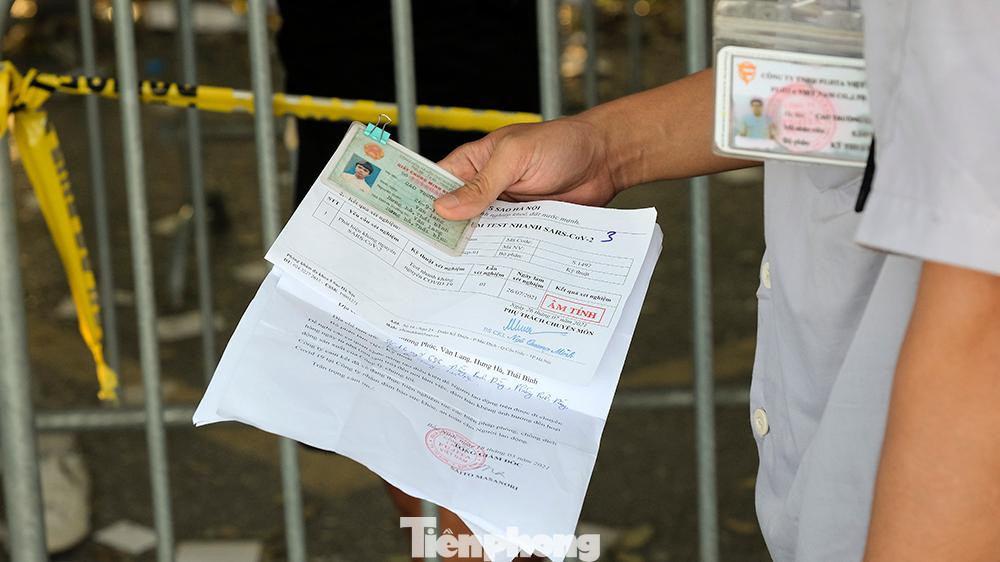 | Những người bắt buộc phải di chuyển với công việc thật sự cần thiết đứng xếp hàng, giữ đúng khoảng cách để khai báo y tế. Kể cả những người có giấy xét nghiệm âm tính với SARS-CoV-2. |