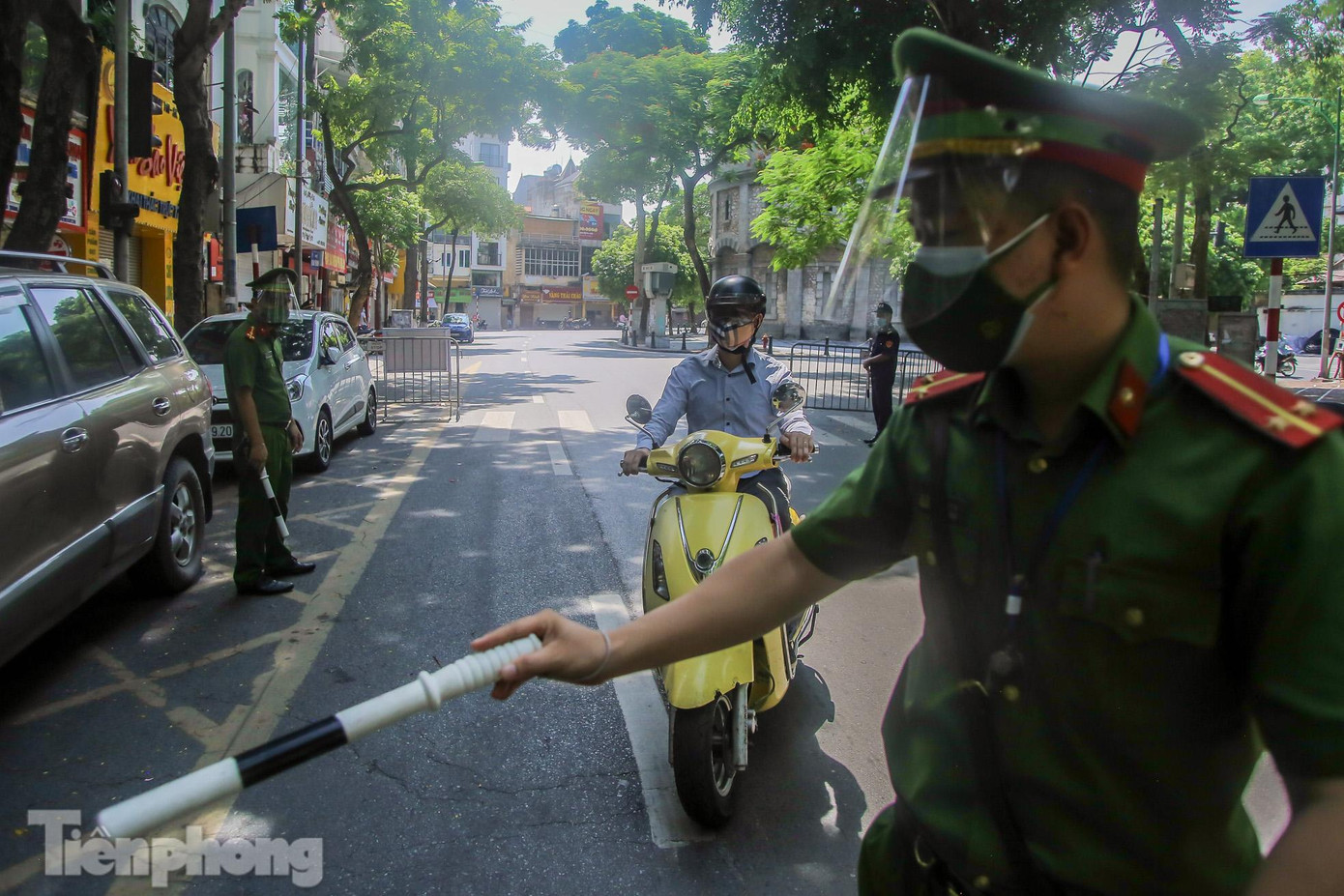 | Các phương tiện trên đường Lê Thái Tổ đều phải dừng tại chốt kiểm tra phường Hàng Trống (quận Hoàn Kiếm, Hà Nội). |