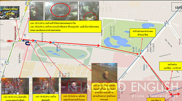 Tờ Khaosod của Thái Lan ngày 20/8 đã có được một báo cáo của cảnh sát, trong đó bao gồm các hình ảnh cho thấy diễn biến hành động của nghi phạm trước và sau vụ đánh bom. Trong ảnh là bản đồ của cảnh sát cho thấy sau khi bỏ balô tại đền Erawan, nghi phạm di chuyển theo chiều mũi tên từ đền Erawan tới công viên Lumpini, cách đền chỉ 1,2 km. Ảnh: Khaosod.