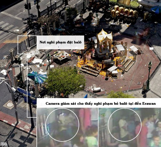 Nghi phạm mặc áo vàng đã được nhìn thấy bỏ một chiếc balô tại đền Erawan, chỉ ít phút trước vụ nổ bom. Đồ họa: BBC.