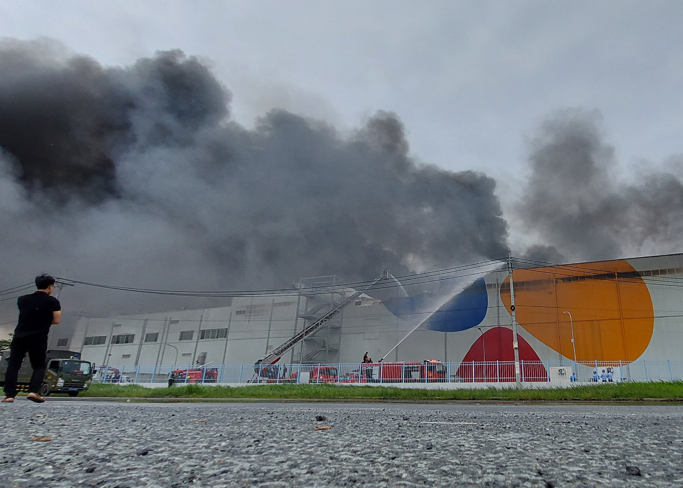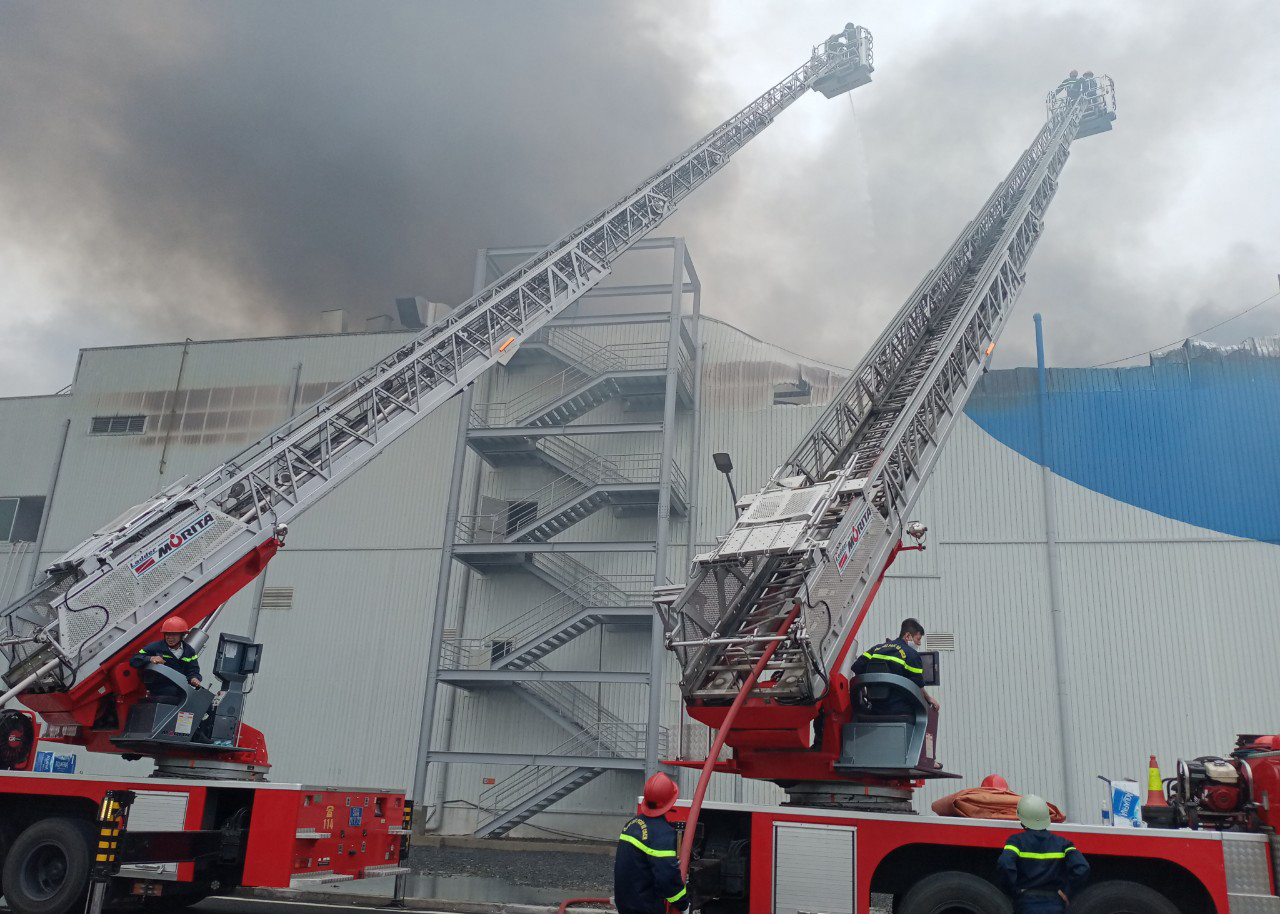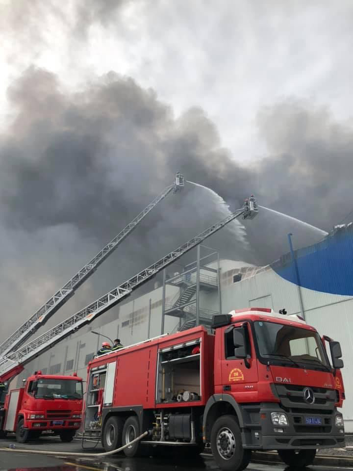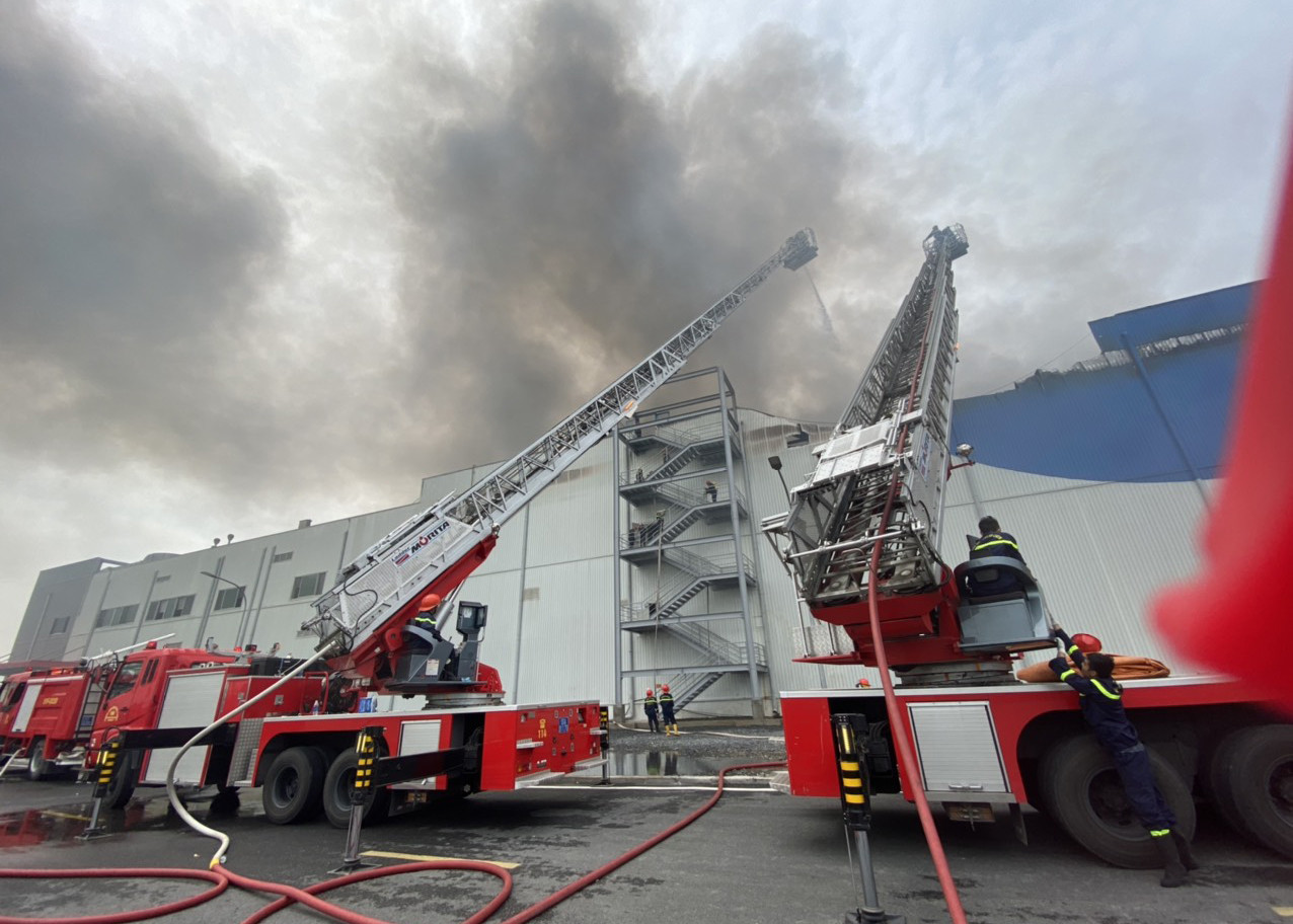 Lúc này, hàng trăm công nhân hốt hoảng tháo chạy ra ngoài. Lực phượng PCCC của khu công nghiệp tiếp cận hiện trường dập lửa.