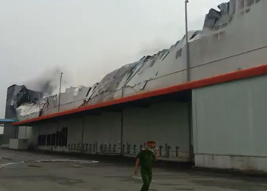 Tuy nhiên, khu nhà xưởng rộng hàng nghìn mét vuông đã bị thiêu rụi, mái tôn đổ sụp.