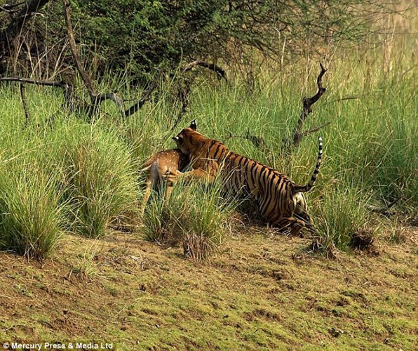 Hổ lao tới tấn công một con hươu đã bị tách khỏi đàn.