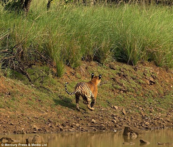 Khi phát hiện đàn hươu sao ẩn nấp giữa cánh đồng cỏ bên kia sông, con hổ nhanh chóng tiếp cận rồi đột ngột bứt tốc truy đuổi con mồi.