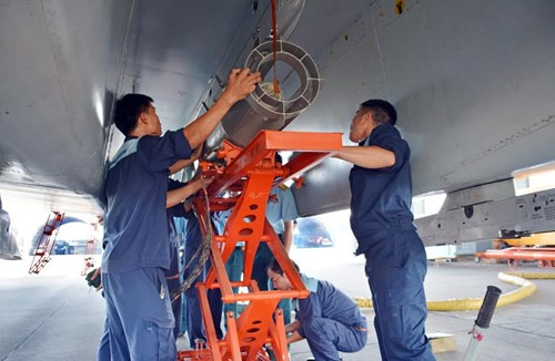 Nhân viên kỹ thuật lắp bom và rốc két vào máy bay