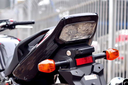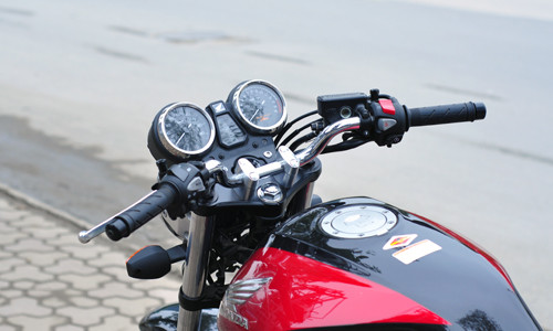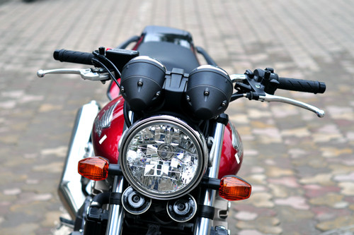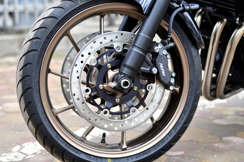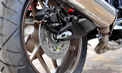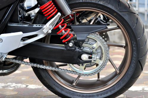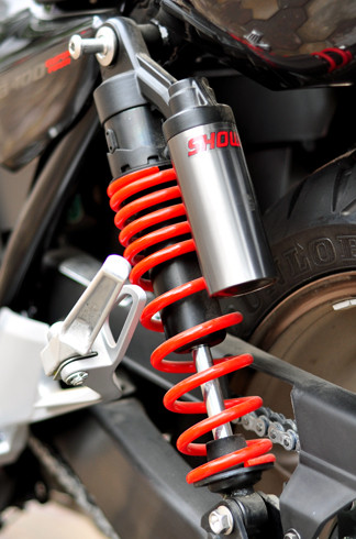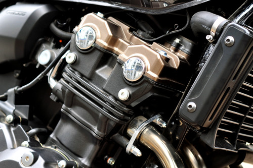 Bên cạnh đó, Honda còn trang trí thêm nắp đậy xi-lanh cùng tông màu đồng với vành hợp kim đa chấu. Giảm xóc sau màu đỏ của Showa và ống xả mạ crôm sáng bóng.