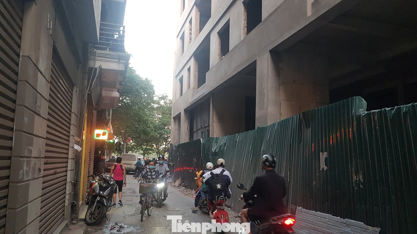 Phía ngoài công trình được rào chắn bởi hàng rào tạm bợ và không có bảng biểu thông tin về dự án công trình.
