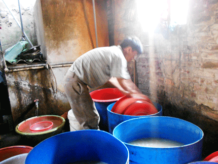 Anh Nguyễn Văn Du, một trong những hộ làm bánh đa cho biết: “Làm nghề này vô cùng vất vả, phải thức khuya dậy sớm. Để có thể cho ra lò những phên bánh đa vào buổi sáng sớm, người làm bánh đa phải thức dậy từ 3h sáng để xay bột, tráng bánh, chưa kể việc ngâm gạo phải thực hiện tối hôm trước.”