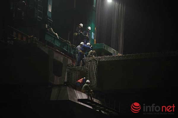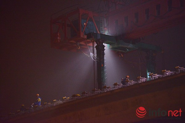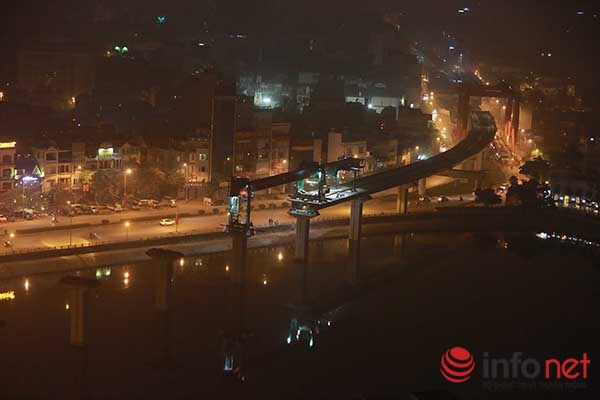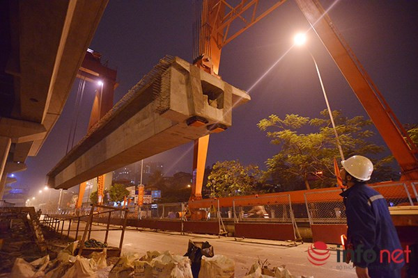 Đêm qua (20/1), những thanh dầm khổng lồ đầu tiên đã bắt đầu được lao qua các nhịp trụ cầu của tuyến đường sắt trên cao Cát Linh - Hà Đông đoạn qua hồ Hoàng Cầu (Đống Đa, Hà Nội).