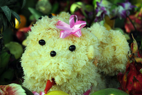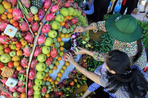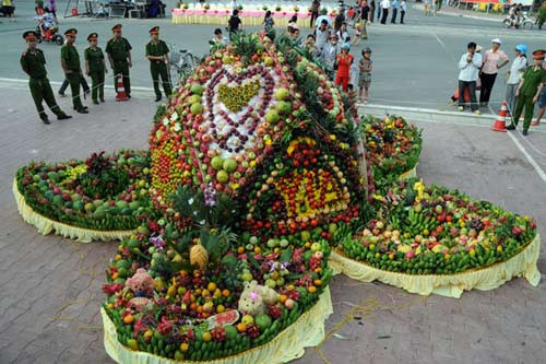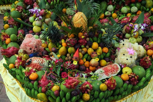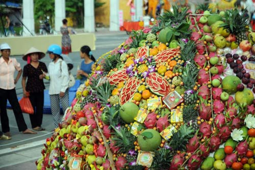 Nhiều loại hoa quả, bánh kẹo, những sản vật của địa phương được các nghệ nhân khéo léo xếp thành hình đóa hoa sen khổng lồ.