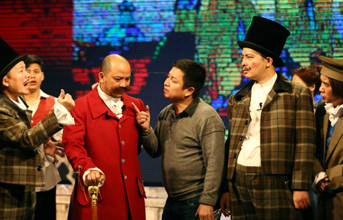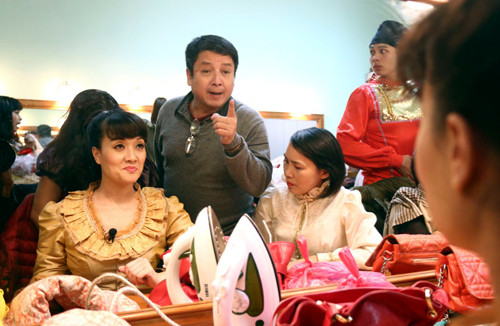 Đạo diễn Chí Trung cùng các diễn viên trong đoàn chuẩn bị trang phục cho vở diễn Quan thanh tra.