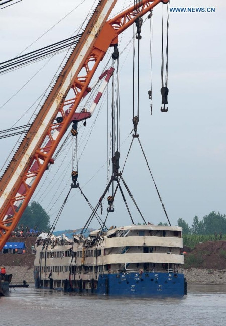Ảnh chụp hôm qua cho thấy các cabin, khi con tàu đang được nâng lên trên sông. Theo CCTV, số người chết trong vụ việc này tính đến hôm qua đã tăng lên 103 người khi lực lượng cứu hộ phát hiện thêm thi thể. 339 người vẫn mất tích và chỉ có 14 người sống sót.