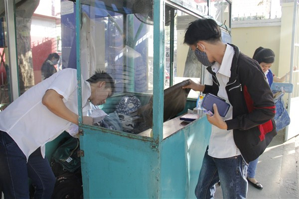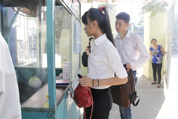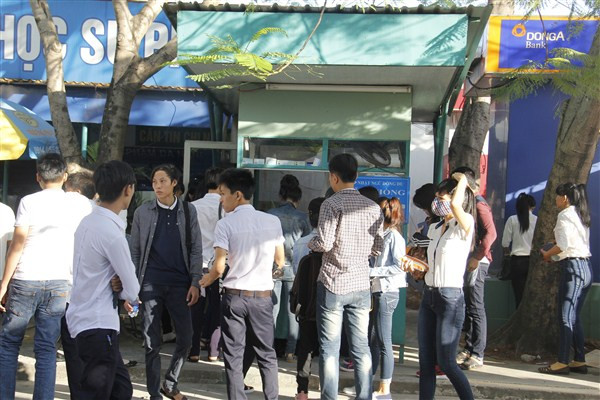 Thí sinh chen chúc gửi đồ tại một ki ốt nhỏ trong sân trường rất mất thời gian, và những trường hợp quên bút, thước… phải quay lại lấy rất xa. Ảnh: Thanh Trần.