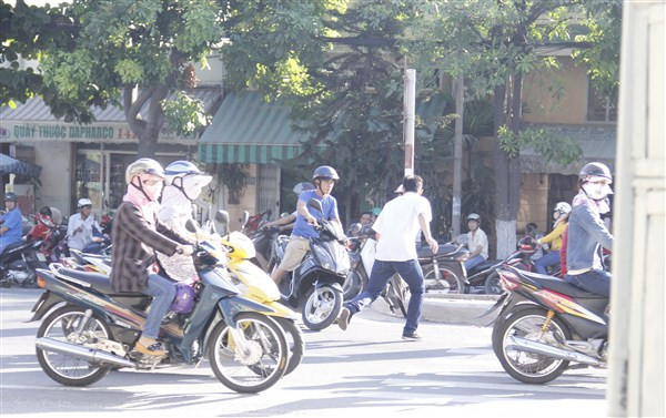 Sát giờ vào phòng thi, rất nhiều thí sinh hớt hải xin ra ngoài vì quên thước, compa. Trong ảnh: Nam thí sinh tại điểm thi trường ĐH Sư Phạm Đà Nẵng băng qua đường lấy thước, compa vào làm bài thi môn Toán. Ảnh: Thanh Trần.