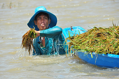 Ngày 29/8, phóng viên Tiền Phong có mặt tại cánh đồng mênh mông nước, nhấn chìm hàng trăm héc ta lúa ở xã Vĩnh Gia (Tri Tôn, An Giang). Tại đây, nhiều người từ sớm đã ngâm mình dưới nước, lặn ngụp cầm lưỡi hái gặt lúa.