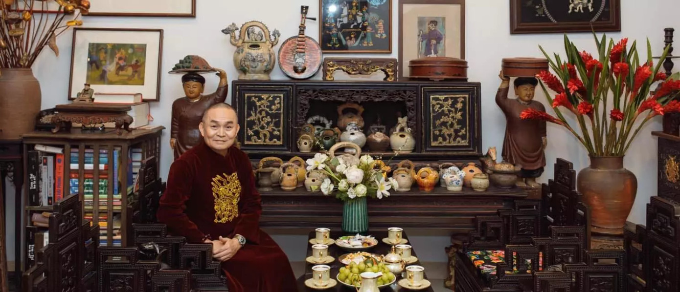 | Tủ khảm trai, hoành phi câu đối, các bình vôi cổ,... được nghệ sĩ Xuân Hinh trưng bày kín nhà. |