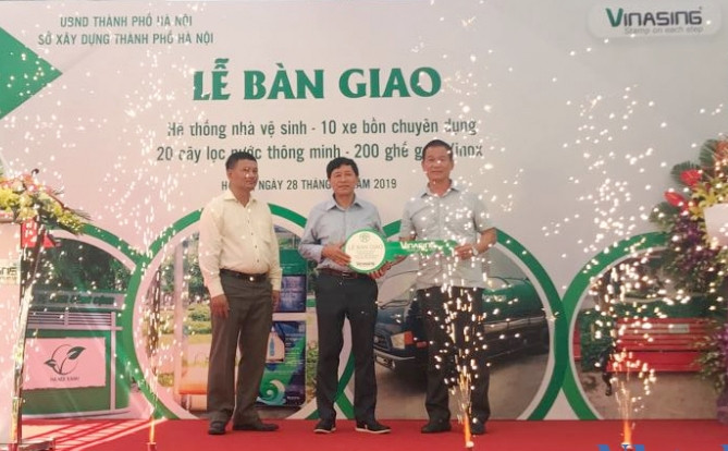 Mặc dù báo cáo với đại diện UBND thành phố và các Sở ngành Hà Nội tại lễ bàn giao giai đoạn 3 của dự án được tổ chức vào quý II/2019, lãnh đạo Cty Vinasing cho biết, nhà đầu tư đã bàn giao cho thành phố Hà Nội hệ thống nhà vệ sinh và các công trình kèm theo như 10 xe bồn chuyên dụng, 20 cây lọc nước và 200 ghế ngồi tại nơi công cộng. Trên phông buổi lễ cũng đề rõ các nội dung này. Ảnh: PV