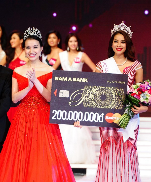 Đón nhận vương miện từ cựu hoa hậu Thùy Lâm.