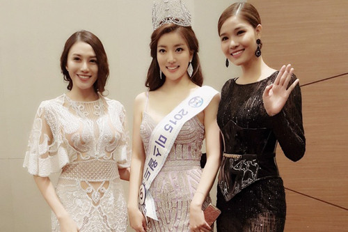 Hai người đẹp Lê Hà (trái) và Kỳ Hân đi xem chung kết và chụp ảnh cùng tân Hoa hậu.
