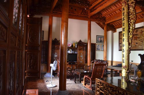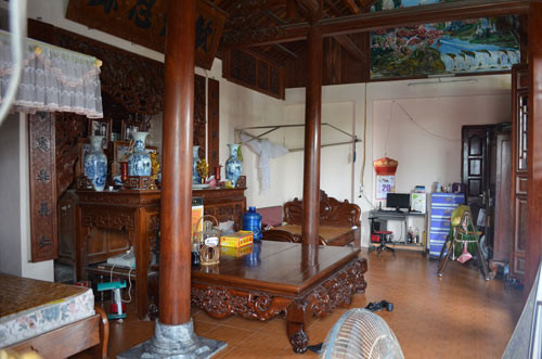 Gian giữa được bày bộ hương án, bên dưới là bộ sập gụ màu nâu,hai gian bên cạnh là phòng nghỉ. Trước cửa gian giữa kê bộ bàn ghế dùng để uống trà, đọc sách...