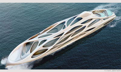 Những chiếc du thuyền có hình dáng lạ mắt. "Cấu trúc khung ngoài của thân trên là một mạng lưới thanh đỡ đan xen với độ dày khác nhau, mang đến vẻ tự nhiên cho ngoại thất", Hadid cho biết. Bộ khung cũng rất giống cấu tạo xương của các động vật biển. Zaha Hadid.