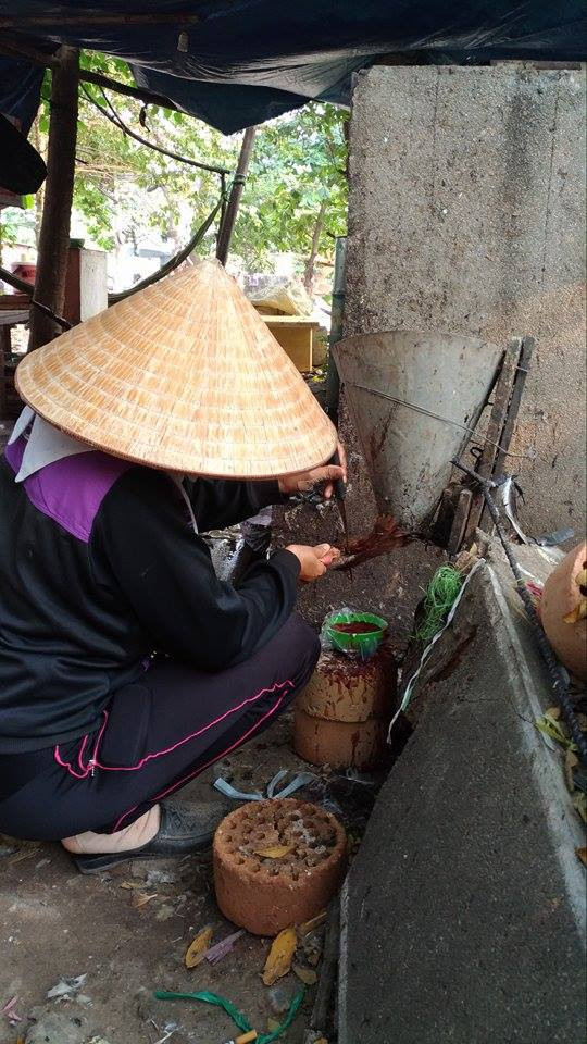 Chọn được con vừa ý, người phụ nữ đem con gà ra chỗ giết mỗ, nơi có 2 người khác đang ngồi làm vịt. Con gà được chọc tiết rồi cho vào nồi nước sôi, sau đó lấy ra cho vào một cái thau lớn nước sẫm màu, lợn cơn lông gà, lông vịt để vặt lông. Qua trình chỉ diễn ra chưa đầy 5 phút.