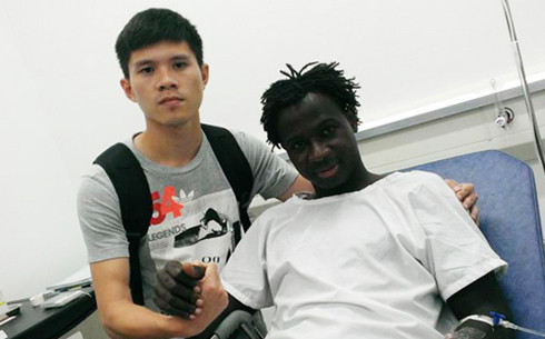 Trung vệ Dương Thanh Hào (trái) đến xin lỗi và động viên Abass trước khi đồng nghiệp lên bàn mổ.