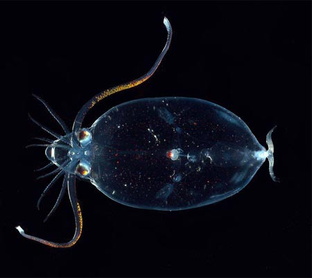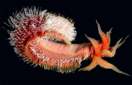 10 phần phụ giống những xúc tu trên đầu của giun mực dài hơn toàn bộ thân chính của nó và được sử dụng để thu lượm thức ăn trong nước.