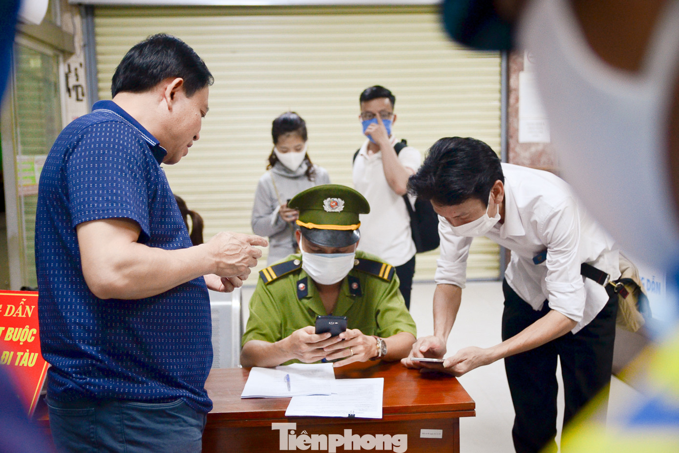 Trước khi vào nhà ga, hành khách được yêu cầu rửa tay bằng dung dịch sát khuẩn và tiến hành khai báo y tế tại chỗ dưới sự hướng dẫn của lực lượng chức năng.