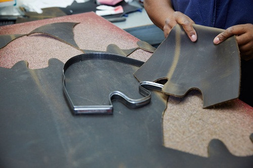 Thợ thủ công sẽ dùng khuôn cắt những mảnh da theo hình dạng định trước. Điều này đòi hỏi tay nghề thành thạo và độ chính xác cao. Trong hình là bản cắt dành cho mẫu bốt dùng cho người chăn bò Nam Mỹ (Gaucho boot). Sau đó, miếng da được kiểm tra độ gập nhằm đánh giá chất lượng da thuộc có phù hợp cho các công đoạn sau hay không.