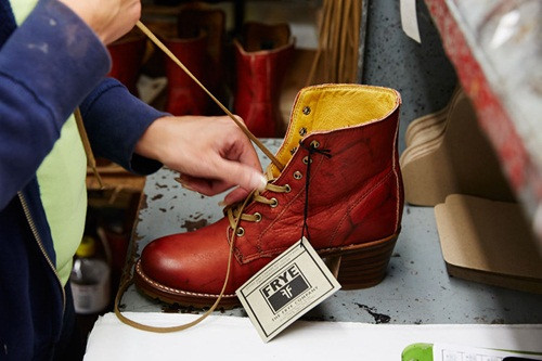 Vẻ đẹp của những đôi bốt nhà Frye (thương hiệu làm giày lâu đời của Mỹ) bắt nguồn từ khâu chọn chất liệu. Các chủng loại da thuộc trên khắp thế giới đều được sử dụng trong quá trình sản xuất này. Da được cuộn thành những cây nhỏ, chất trên kệ và đánh mã số để những người thợ thủ công dễ dàng nhận diện và chọn lựa theo màu sắc, đặc tính chất liệu mong muốn.