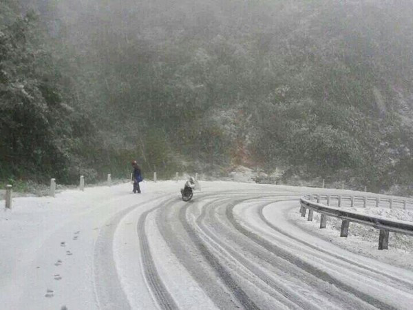 | Tuyến phủ trắng mặt đường trên đèo Ô Quy Hồ. Ảnh: VnExpress |