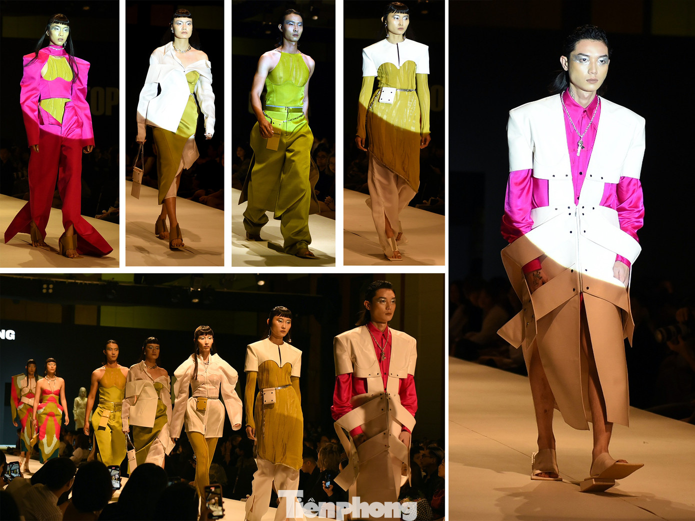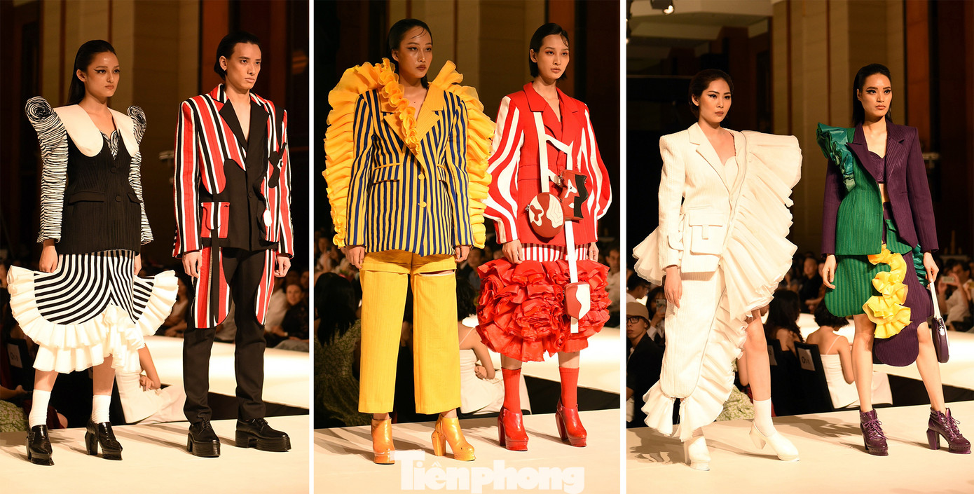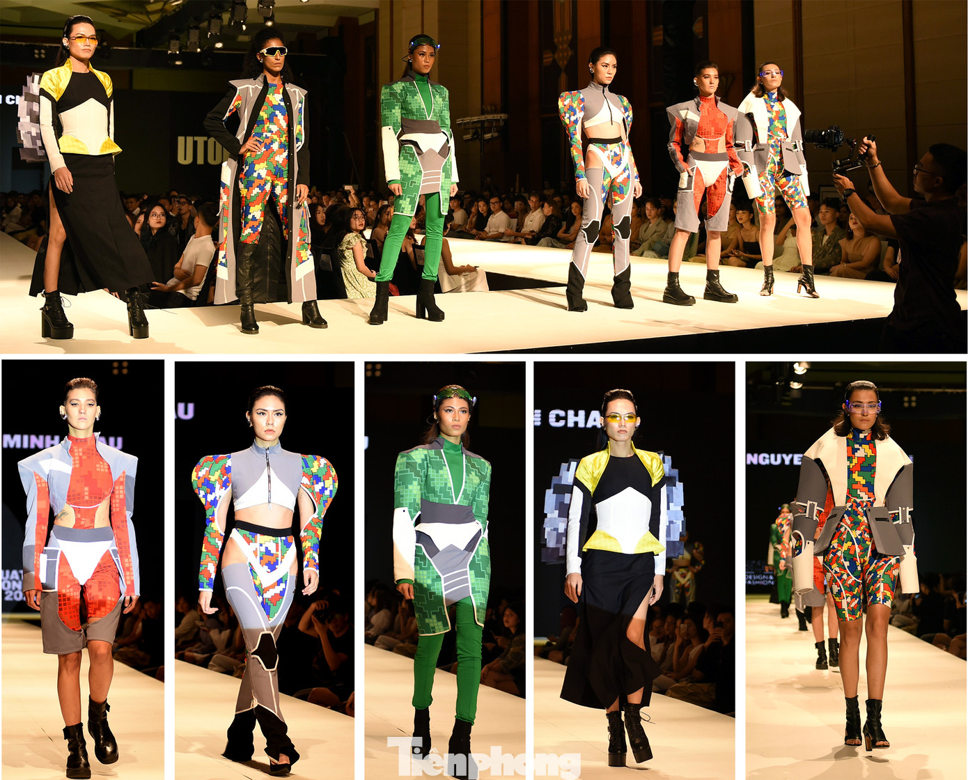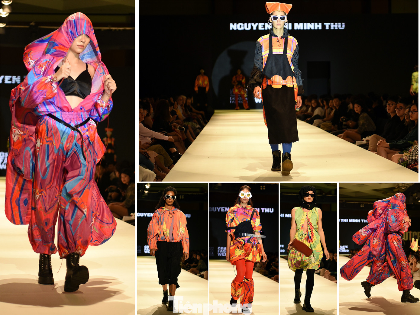 Nguyễn Thị Minh Châu có bộ sưu tập “Let’s go - Nào mình cùng đi” lấy cảm hứng từ chính món đồ chơi từ nhỏ của Minh Châu: những mảnh ghép Lego đầy sắc màu, tích hợp thêm công nghệ như AI - trí tuệ nhân tạo. Những thiết kế trong bộ sưu tập được dựng cấu trúc cứng cáp cùng chi tiết cầu vai lớn gợi sự liên tưởng đến những chú robot. Kỹ thuật in trên vải được sử dụng tạo nên những họa tiết bắt mắt như những miếng ghép Lego và những vi mạch điện tử.