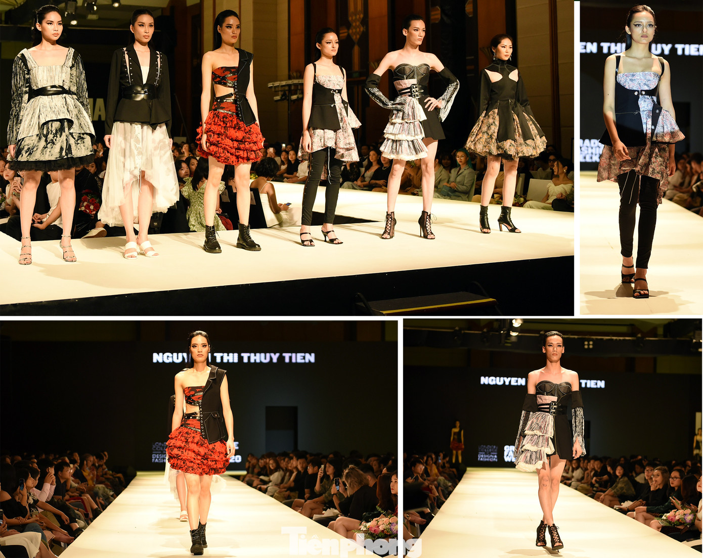 Nguyễn Thị Thủy Tiên trình làng bộ sưu tập “ Memoir of a liar - Hồi ức của kẻ nói dối”. Bộ sưu tập thể hiện sự cảm thông và ngưỡng mộ của tác giả dành cho những người phụ nữ mạnh mẽ xung quanh mình. Bộ sưu tập bao gồm thiết kế áo blazer, áo corset và chân váy gợi cảm nhưng không kém phần cá tính. Những chi tiết cắt xẻ táo bạo cùng những điểm nhấn làm từ chất liệu da mang tới cảm gai góc, dữ dội như những “trận chiến” trong cuộc sống mà người phụ nữ phải trải qua. Tông màu đen được lựa chọn làm chủ đạo với nét chấm phá của sắc đỏ tạo cảm giác như những vết thương đang rỉ máu nhưng cũng đồng thời là sự nổi loạn, phản kháng lại những điều bất công đối với chính mình.